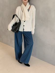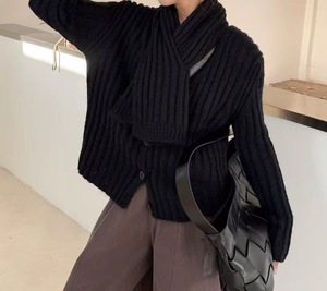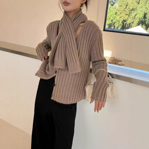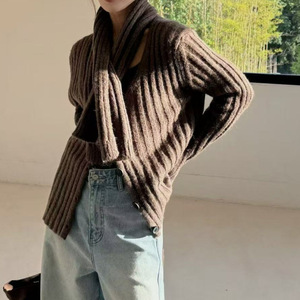 新款冬季韩版时尚马海毛羊毛V领宽松坑条开衫保暖毛衣(配围巾)