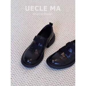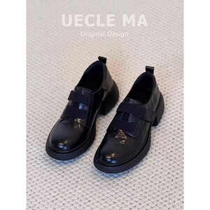 牛皮版~厚底乐福鞋女2025新款魔术贴复古圆头小皮鞋粗跟通勤单鞋