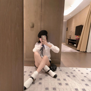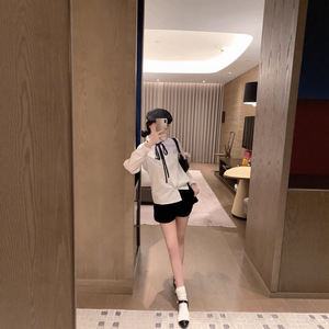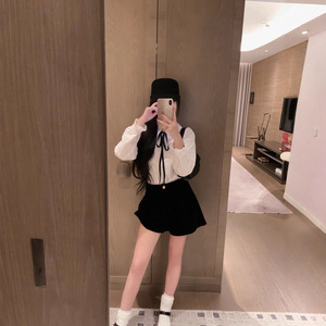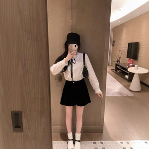 南油2025法式复古优雅小立领系带蝴蝶结衬衫+M系丝绒短裤两件套装