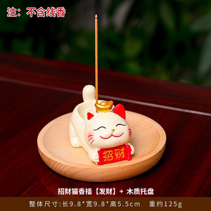 招财猫香插【发财】+木制托盘+线香【三件套】