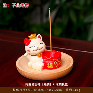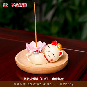 招财猫香插【好运】+木制托盘+线香【三件套】