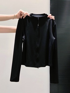 灰色立领双拉链长袖t恤女2025早秋新款修身显瘦简约气质短款上衣