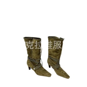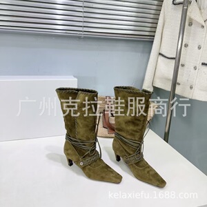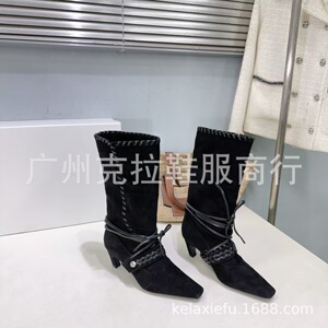 高定2025秋冬游牧风麂皮编织小方头复古高跟绑带中筒时装靴马丁靴