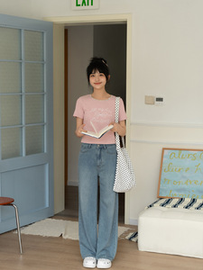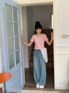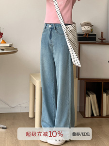 忠犬小八梨形自制休闲宽松直筒牛仔裤女小个子浅蓝薄款长裤裤子