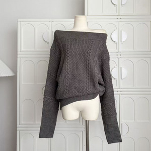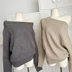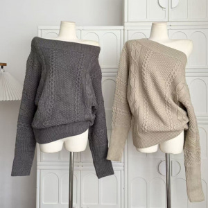 斜肩绞花长袖毛衣女秋季新款慵懒宽松休闲简约套头针织上衣