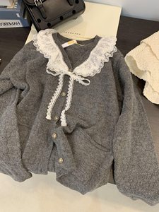 娃娃领毛衣女秋慵懒可爱甜美蕾丝V领针织开衫外套日系温柔上衣