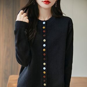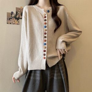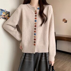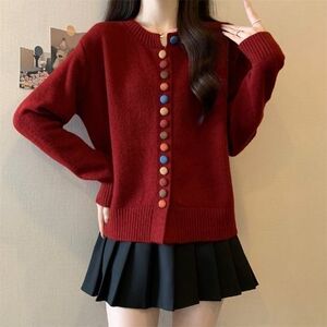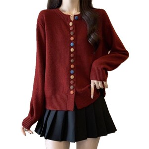 彩色纽扣圆领针织开衫女安可拉红宽松叠穿长袖春秋小香风毛衣外套