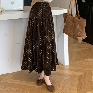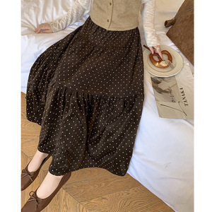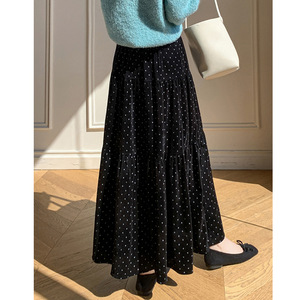 2025秋冬新款法式麂皮绒印花圆点半身裙女松紧腰a字拼接蛋糕长裙