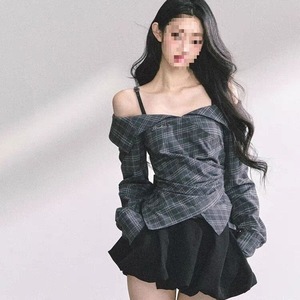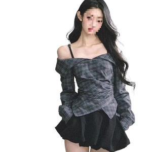 伦敦往事一字长袖格子显瘦上衣衬衫半裙套装短裙秋季新款两件套