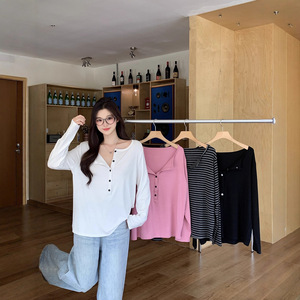 大码设计感纯色纽扣半开领宽松长袖T恤女秋季慵懒风百搭休闲上衣