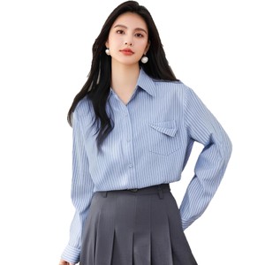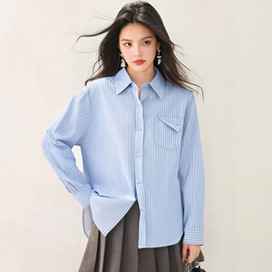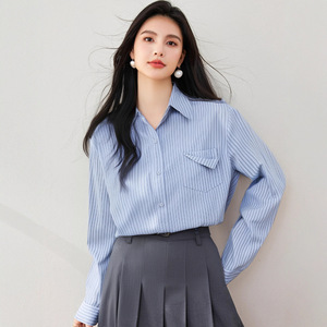 条纹宽松蓝色衬衫女秋装翻折口袋设计感小众长袖上衣叠穿职业通勤