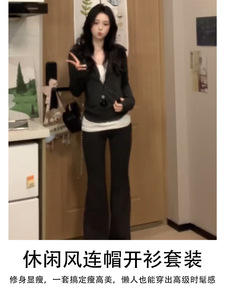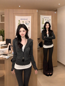 灰色修身连帽短外套女运动正肩卫衣早秋季老钱风初秋冬天穿搭套装