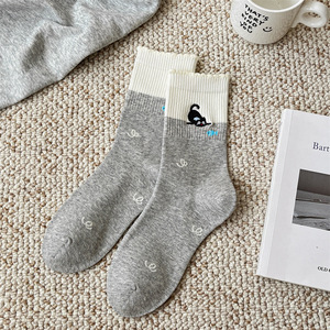 春秋款袜子女点子纱可爱卡通猫咪纯棉中筒袜灰色系秋冬日韩学院风