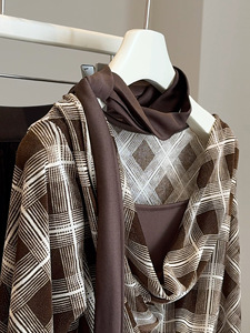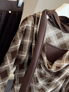 格子荡领飘带长袖T恤女2025早秋新款时尚洋气收腰假两件小衫上衣