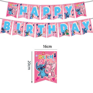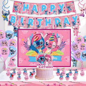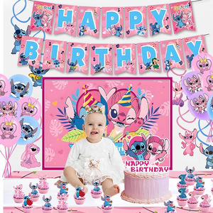 粉色史迪仔生日派对装饰横幅气球蛋糕插排插牌Stitch派对背景布