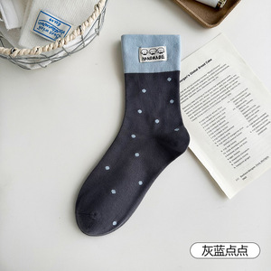 可爱卡通小狗布标袜子女简约学院风撞色中筒袜吸汗透气亲肤堆堆袜