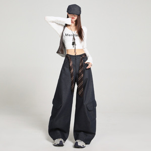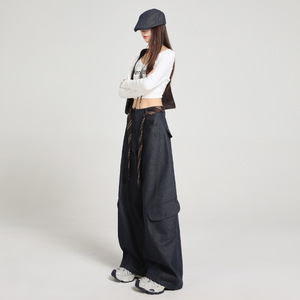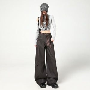 新中式工装裤子女秋季新款高腰宽松辣妹设计感弯刀阔腿垂感拖地裤