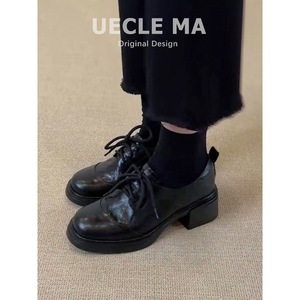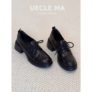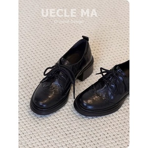 牛皮版~厚底小皮鞋女英伦风系带单鞋黑色高跟鞋粗跟学院风乐福鞋
