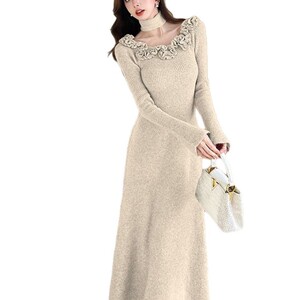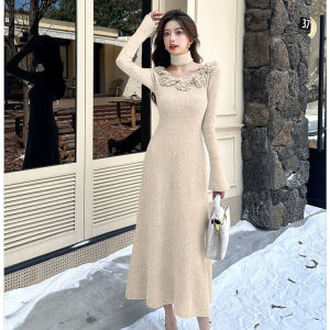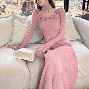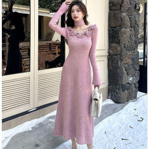 温柔风圆领围脖花朵气质针织衫秋冬新款优雅复古收腰毛衣连衣裙女