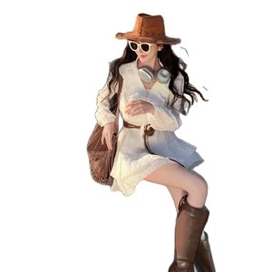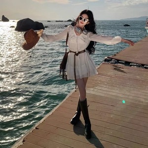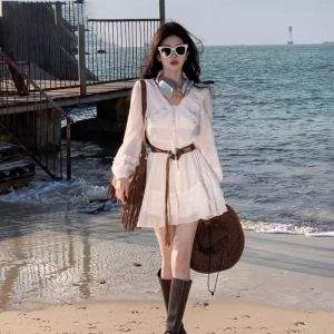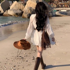 海边大西北旅游穿搭沙滩裙V领小个子长袖白色短裙洱海拍照连衣裙