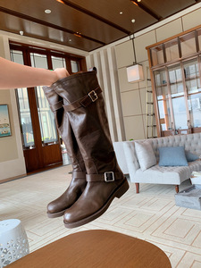 牛皮版~复古尖圆头皮带扣粗跟长靴女秋冬新款显瘦靴子真皮骑士靴