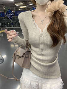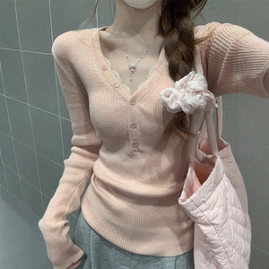 网红甜辣风深纯欲针织衫上衣女秋冬纽扣半开领紧身毛衣打底内搭