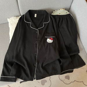 宝蓝格子HelloKitty纯棉纱布情侣睡衣女春秋款长袖男士家居服夏季