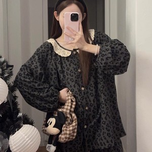 德绒睡衣女秋冬新款蕾丝花边豹纹灰色娃娃领公主风花边家居服套装