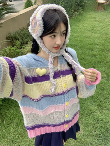 实拍~新款韩系甜美减龄彩虹撞色连帽爱心宽松开衫毛衣外套