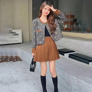 刺绣高级感小香风毛呢外套女短款2025秋冬新款时尚百褶短裙两件套