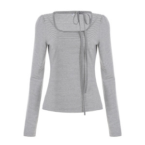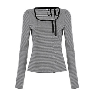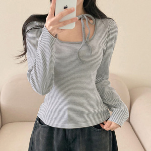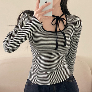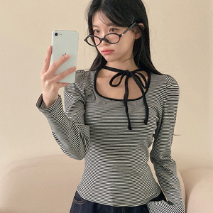 韩系少女风围脖系带设计感蝴蝶结长袖T恤气质百搭条纹印花上衣