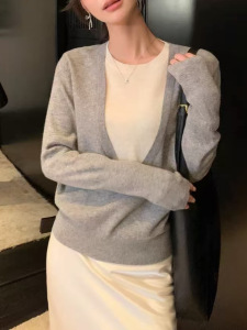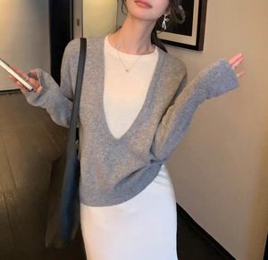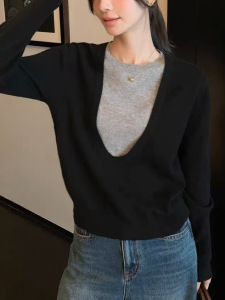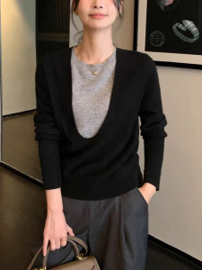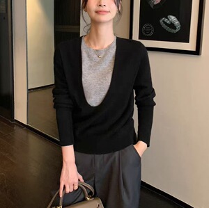设计感假两件大U领100羊毛显瘦针织衫女春秋宽松毛衣