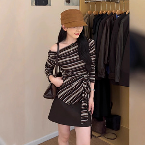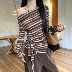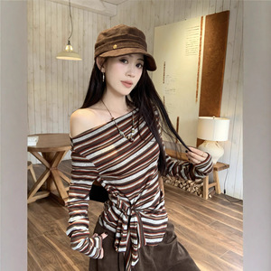温柔风复古条纹德绒斜肩长袖T恤女2025秋季绑带收腰显瘦露肩上衣