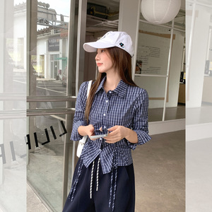 实拍 韩版格纹翻领抽绳收腰衬衣女2025秋季百搭复古长袖衬衫上衣