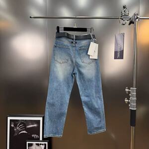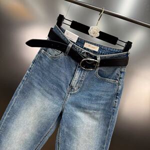 法式极简风复古洗水弹力牛仔裤配腰带9分裤显瘦