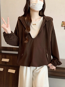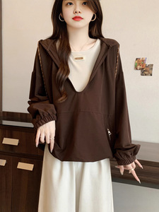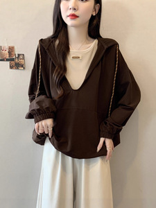 假两件美拉德连帽正肩卫衣女2025秋大码胖mm下摆松紧腰上衣A7613