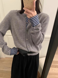 韩系设计感拼接长袖针织开衫女2025秋季新款灰色毛衣外套气质上衣