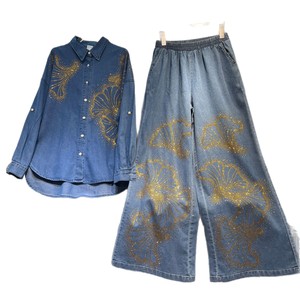 欧洲站复古长袖牛仔衬衫女2025秋季女装新款重工烫钻阔腿长裤两件
