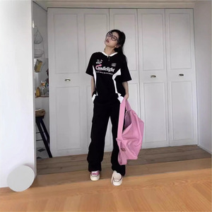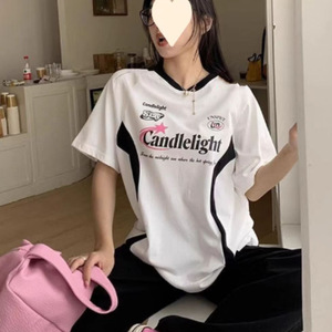 时尚潮牌爆款百搭机车拼色印花短袖t恤女夏季拼接宽松百搭上衣ins