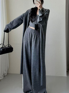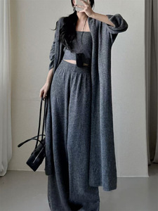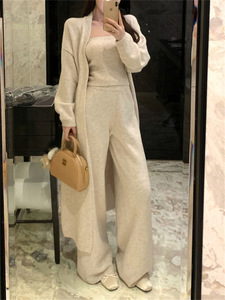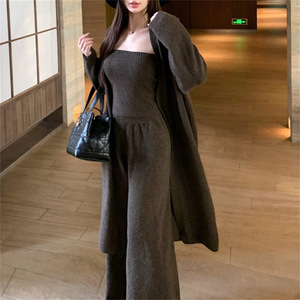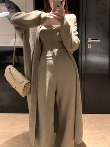 秋冬新款跨境外贸时尚针织套装女宽松慵风懒抹胸直筒裤毛衣三件套