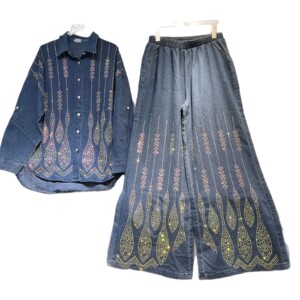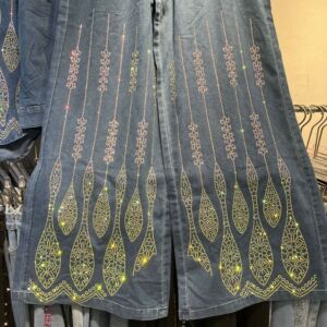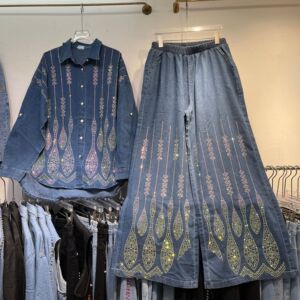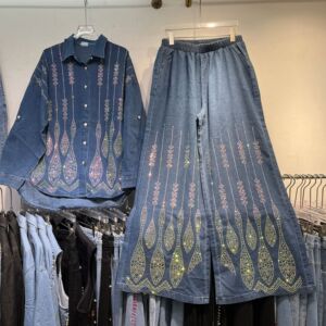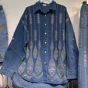 线条设计感烫钻牛仔衬衫女欧洲站重工大码显瘦阔腿牛仔裤两件套