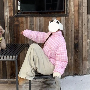 2025新款学院风甜美短款粉色格纹立领棉服女冬季时尚防寒外套