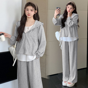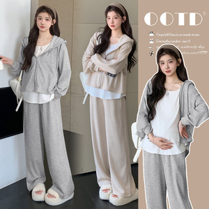 孕妇装秋季套装2025新款韩版时尚假两件连帽卫衣裤子孕期产检穿搭