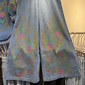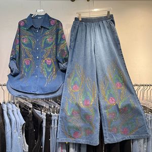 重工设计感民族风烫钻牛仔套装女2025秋季衬衫 + 阔腿裤两件套