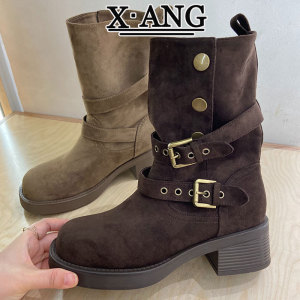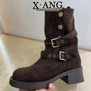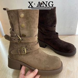 牛皮版两穿马丁靴女款粗跟显瘦骑士靴皮带扣西部牛仔靴中筒靴子女