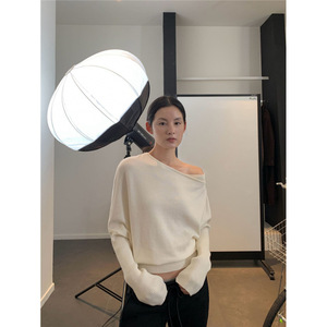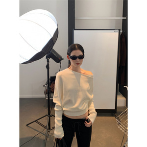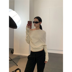 慵懒风一字领露肩山羊绒套头毛衣女设计感韩系宽松斜肩针织衫上衣