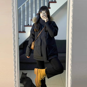 2025新款棉袄美式高级感夹棉衣棉服加厚黑色连帽外套女冬季派克服