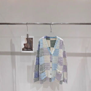 ch25秋冬新款小香风彩色格子V领针织开衫宽松拼色外套