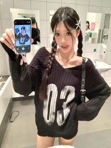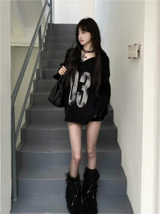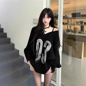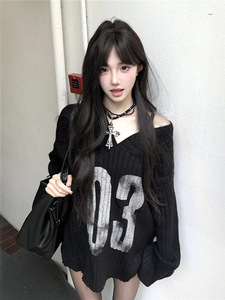 数字印花V领针织衫女2025早秋季美式复古宽松休闲设计感黑色露肩
