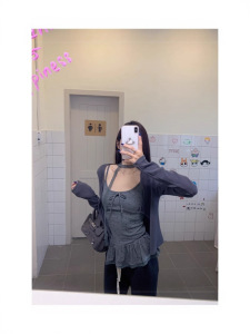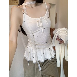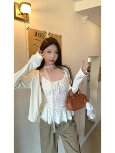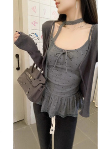 kumikumi甜美风薄款长袖开衫外套女秋季内搭波点蕾丝边吊带两件套